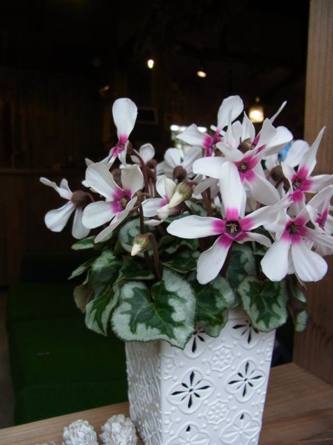 通常シクラメンはうつむくように咲きますが、この品種は見ての通り、
