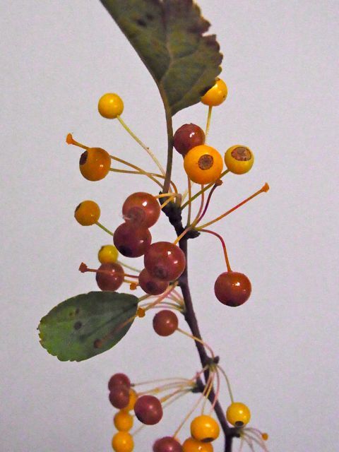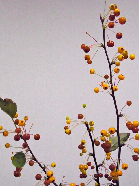 リンゴですか…。 切花 2013.10.212021.01.18 malus baccata、流通名は「バッカータ」とだけ記されていました。 野性のリンゴだと思うのですが変種が多い為、品種特定は出来ませんでし た。 実は大変小さく茶色に近いので、とてもシックな印象をうけます。 熟すと赤くなるのでしょうか? とても興味深い実物です。 s。